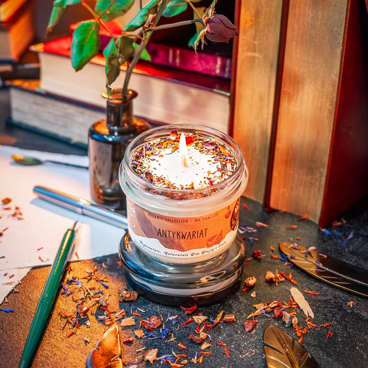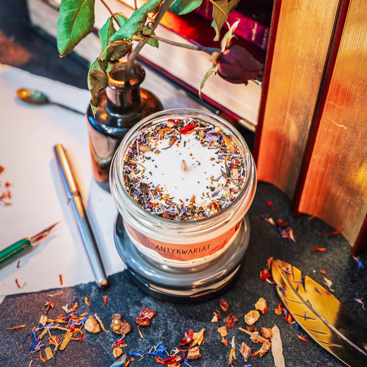„Antykwariat” to wrota w czasie i przestrzeni do urokliwego zacisza pełnego starych książek i tajemniczych historii. Już od pierwszego zapalenia świecy, poczujesz słodką nutę soczystych śliwek, które otulają Cię swoim delikatnym i owocowym aromatem. W tle unoszą się subtelne zapachy rumianku, które przenoszą Cię w świat spokojnej refleksji. Soczysta cytryna rozświetla i podnosi na duchu, tworząc harmonijną mieszankę zapachową. Wewnątrz tej unikalnej kompozycji wyczuwasz też pachnące pączki goździków, które dodają nuty przyprawowego ciepła. Cynamon i ziele angielskie poruszają zmysły wzbudzając nostalgiczne uczucia, a paczula, jeden z głównych składników, emanuje swój mistyczny aromat. Wraz z zapachem madagaskarskiej wanilii, tworzą zniewalającą symfonię, która otacza Cię nutami wyrafinowania i głębi. Świeca wywołuje aurę wyciszenia i relaksu przenosząc Cię do magicznego świata starych książek i tajemniczych zakamarków. Ta świeca jest zaproszeniem do spokojnej, intelektualnej podróży przez niezwykłe spisy i literackie dzieła, które wypełniają przestrzeń antykwariatu.
