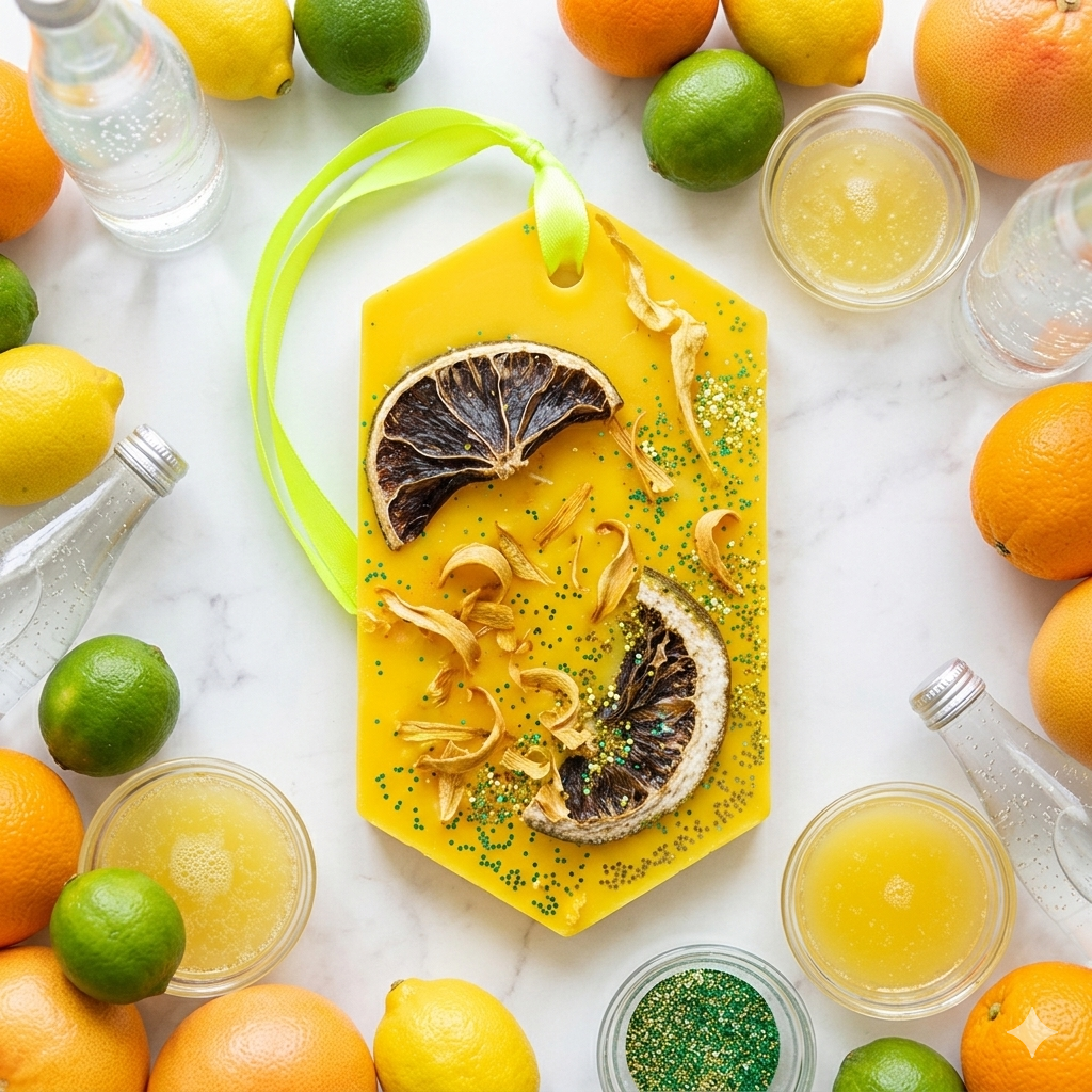 Wśród ozdób znajdziesz limonkę, kwiat pomarańczy i brokat – jak promienie słońca zatrzymane w formie.