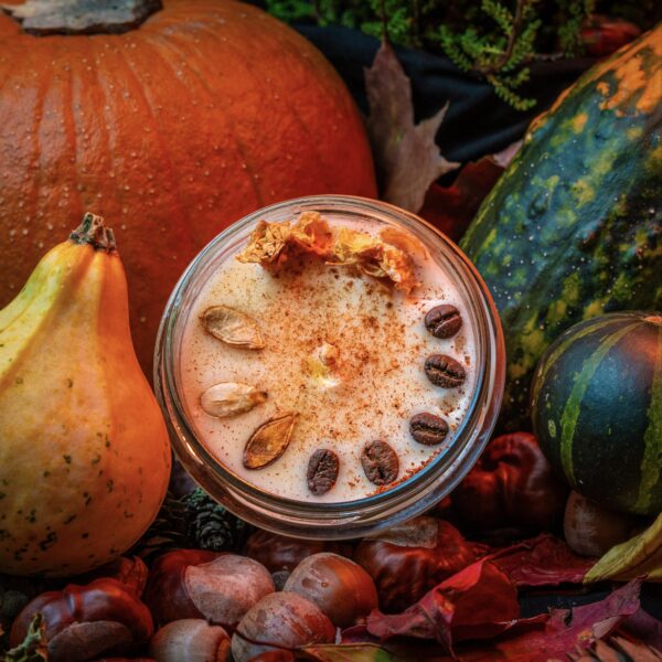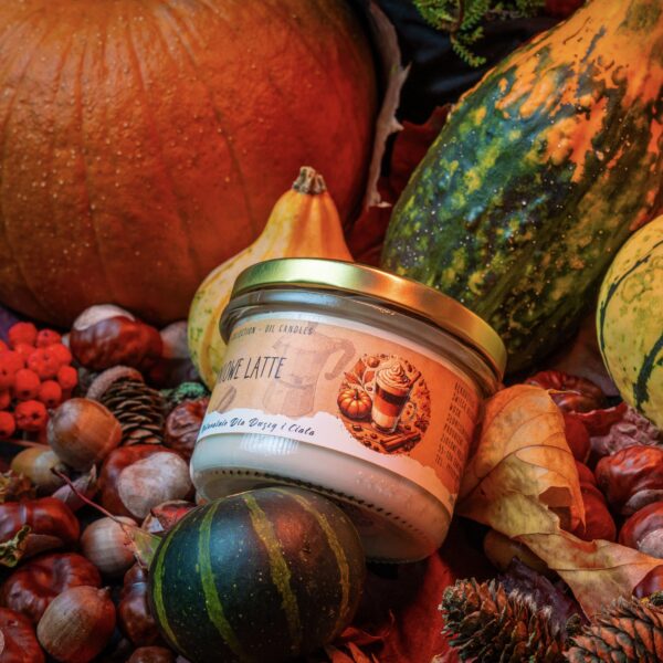 Wykonana z wosku roślinnego z pestek słonecznika z dodatkiem oliwy z oliwek, „Dyniowe Latte” to idealny sposób na wprowadzenie do wnętrza ciepłej, jesiennej atmosfery, która koi zmysły i otula dom aromatem przypraw i kawy.