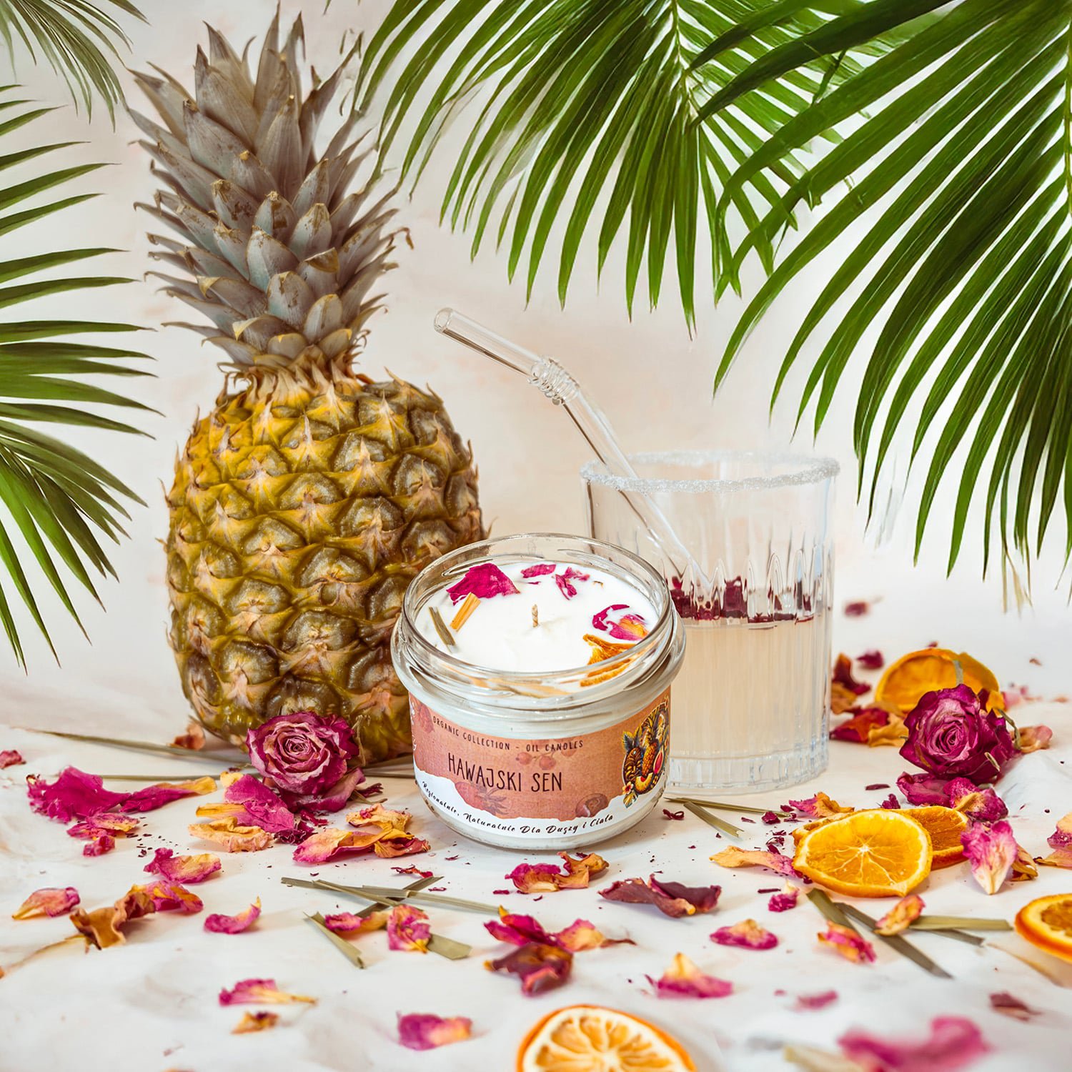 „Hawajski Sen” to świeca, której zapach przenosi cię na tropikalną wyspę pełną słodkich marzeń. Soczysty ananas, orzeźwiająca pomarańcza i zielone jabłko otwierają tę aromatyczną podróż. Kwiatowe akcenty jaśminu i róży nadają delikatności, a cukier waniliowy dodaje nuty słodyczy. Nuty guawy dodają egzotycznego charakteru, tworząc zapachowy sen hawajski, gdzie każdy oddech jest jak powiew tropikalnego wiatru.