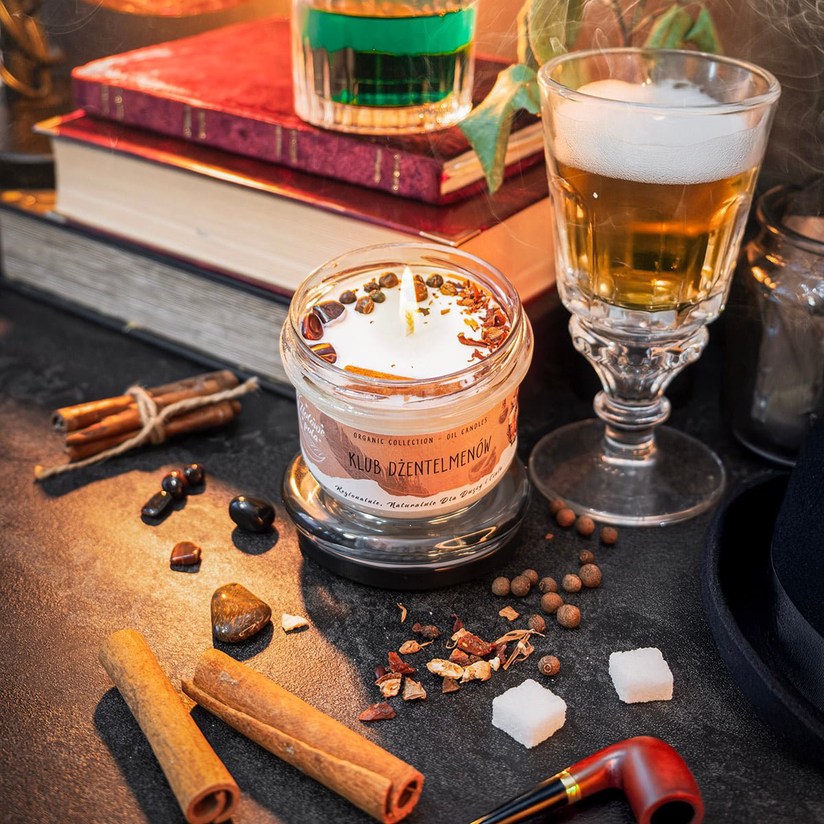 „Klub Dżentelmenów” to kwintesencja elegancji i wyrafinowanego stylu, zamknięta w formie luksusowego dodatku do wnętrza. Jej zapach otwiera się świeżymi, cytrusowymi nutami bergamotki i pomarańczy. Kwiat davany i neroli nadają kompozycji subtelności, tworząc elegancki, lekko słodki akord, który podkreśla wyrafinowany charakter zapachu. W sercu świecy wyczuwalna jest bogata, zmysłowa wetyweria, która wnosi do kompozycji głębię i ziemistość, doskonale współgrając z ciepłą, aksamitną wanilią. Tytoń Perique dodaje zapachowi niepowtarzalnego, szlachetnego charakteru, przypominając o klasycznych klubach dla dżentelmenów, gdzie aromat wysokiej jakości cygar wypełnia powietrze. Labdanum i opoponaks wprowadzają żywiczną, balsamiczną nutę, która dodaje całości tajemniczości i orientalnego uroku. Baza świecy zbudowana jest z drzewa sandałowego i bursztynu, które nadają zapachowi trwałości i ciepła. Drzewo sandałowe wnosi kremową, drzewną elegancję, podczas gdy bursztyn dodaje złocistego, otulającego blasku, sprawiając, że zapach staje się jeszcze bardziej zmysłowy i luksusowy. Świeca, która przenosi Cię w świat luksusu, elegancji i wyrafinowanego smaku. Ten bogaty, wielowymiarowy zapach idealnie sprawdzi się w chwilach relaksu i refleksji, otulając Cię wyjątkową, niepowtarzalną aurą.