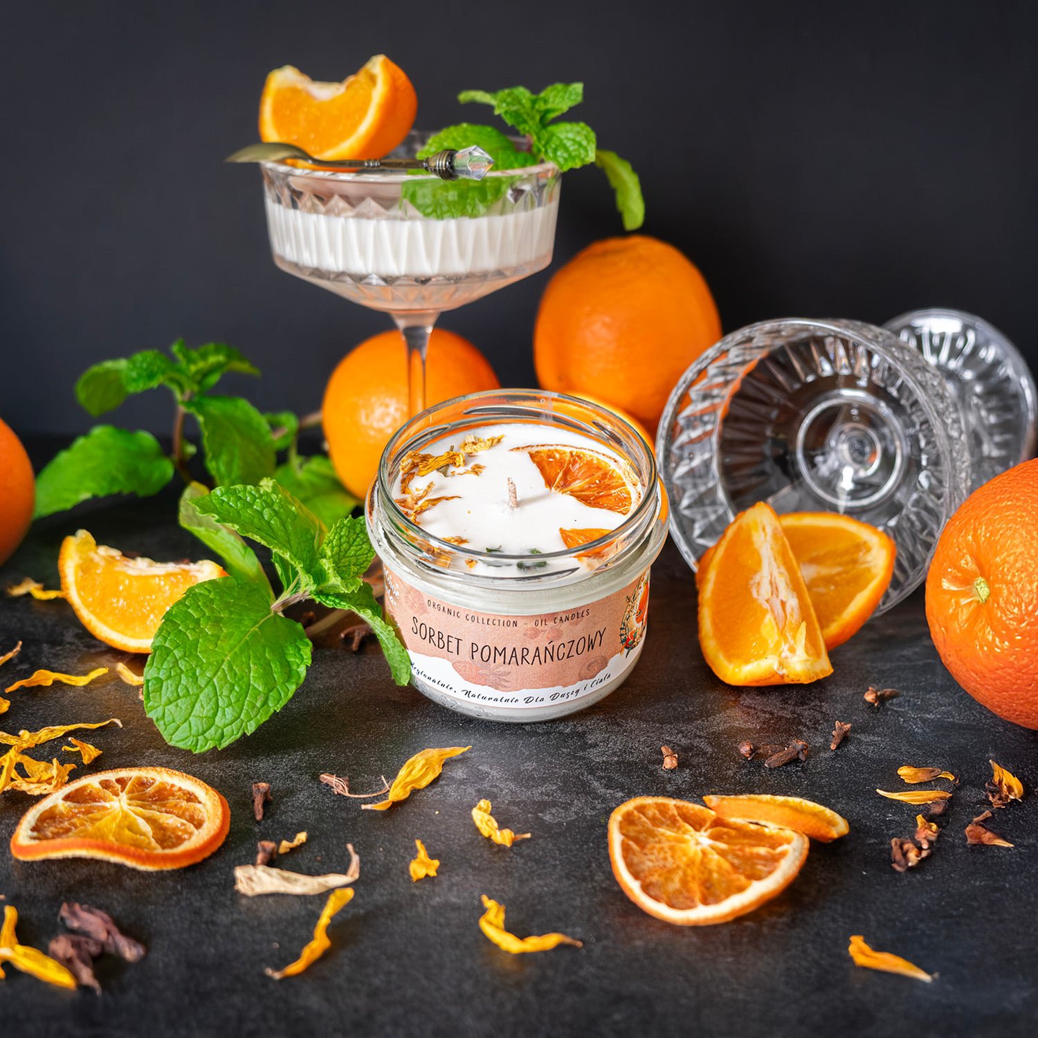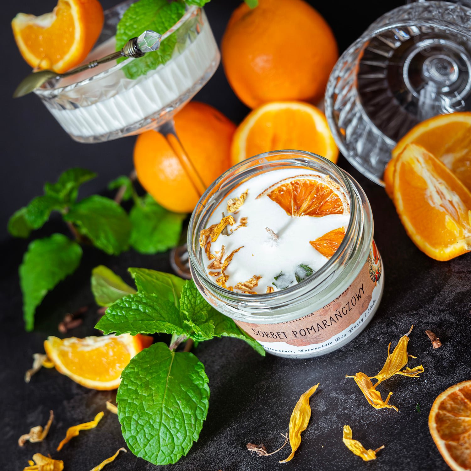 Sorbet Pomarańczowy to lato zamknięte w słoiku. Soczysty, rześki i pełen słońca zapach, który przypomina moment, gdy kroisz dojrzałą pomarańczę, a jej sok tryska na dłonie, uwalniając cytrusową eksplozję aromatu.