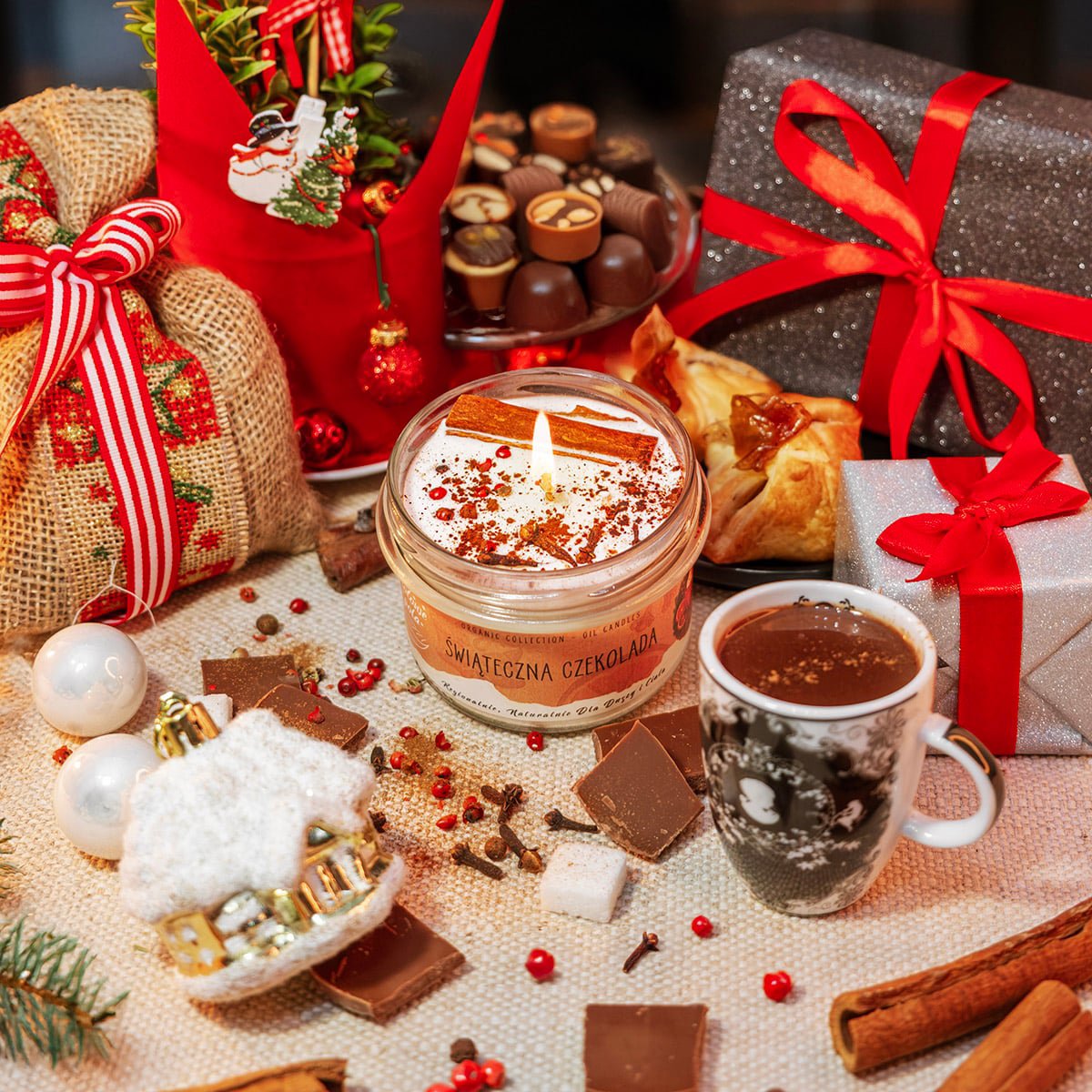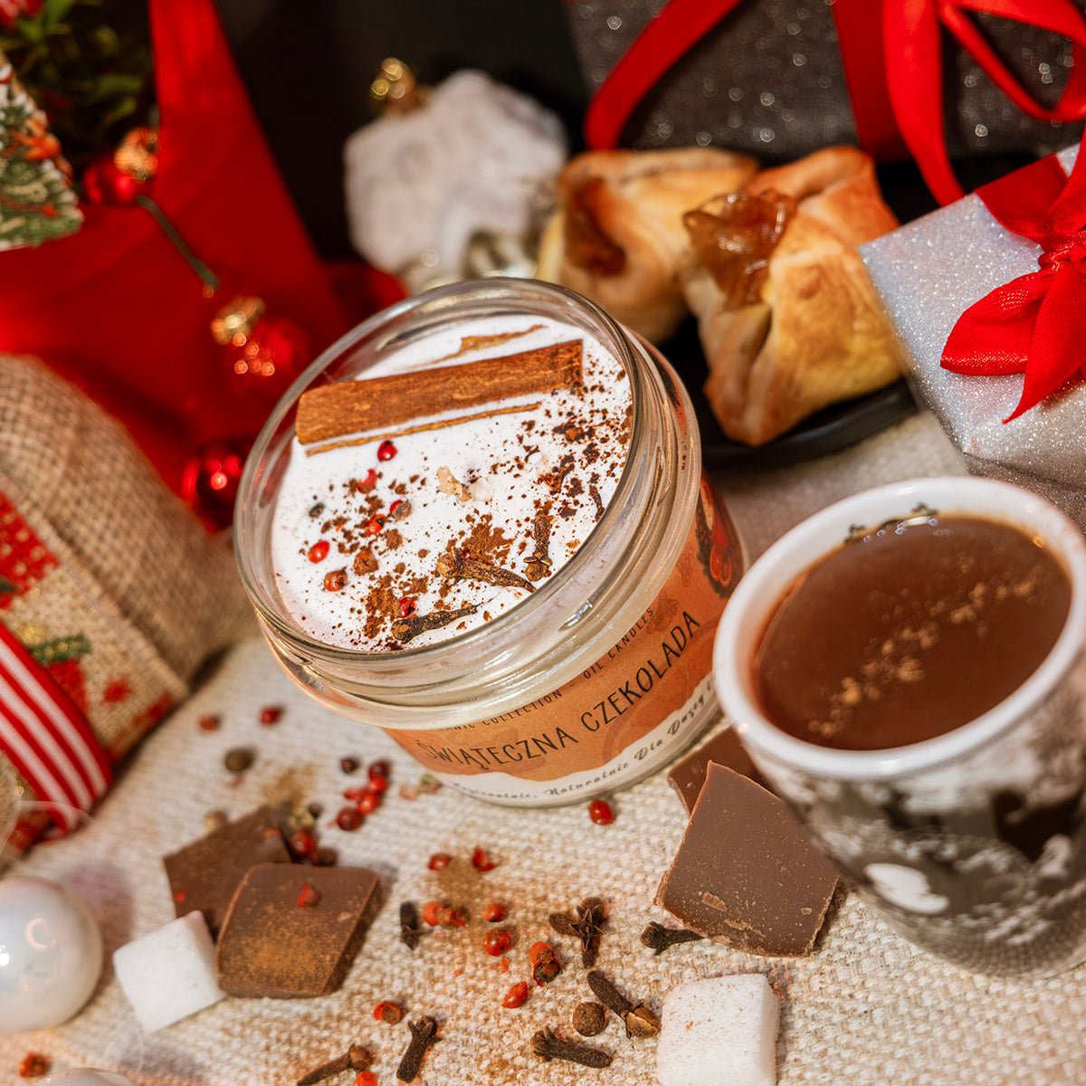 „Świąteczna Czekolada” — świeca, która zamienia wnętrze w ciepły, świąteczny raj pełen słodkich aromatów i zimowych przypraw.