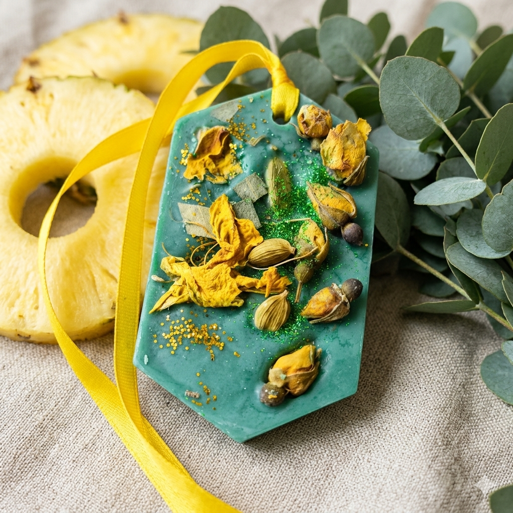 Świeży, soczysty zapach z nutą chłodnej zieleni. Słodycz dojrzałego ananasa przełamana została orzeźwiającym eukaliptusem, tworząc kompozycję pełną lekkości, energii i czystej świeżości. To zapach, który ożywia przestrzeń – egzotyczny, ale nie ciężki. Zielony, rześki i nowoczesny, idealny do wnętrz, w których chcesz poczuć powiew świeżości i subtelnej elegancji. Zawieszka wykonana jest z wosku na bazie oliwy z oliwek, który doskonale przewodzi zapach – stopniowo uwalniając go w zamkniętych przestrzeniach.